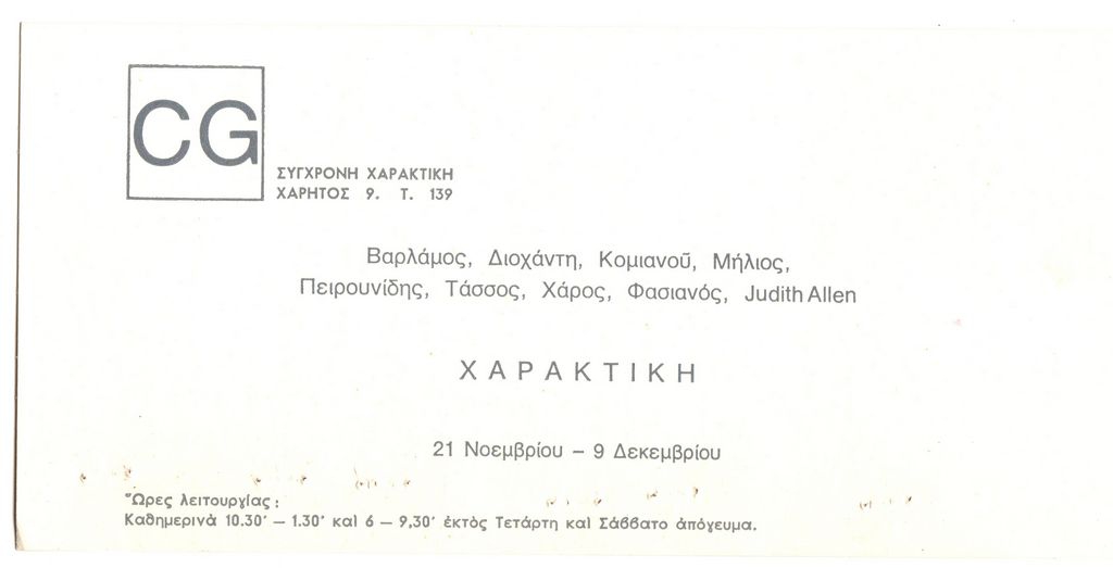 Έντυπο, χαρτόνι, στα ελληνικά, 11×21 εκ., ομαδικής έκθεσης χαρακτικής των Βαρλάμου-Διοχάντη- Κομιανού- Μήλιου- Πειρουνίδη- Τάσσου- Χάρου- Φασιανού- Allen, η οποία διεξάγεται στην γκαλερί Σύγχρονη Χαρακτική στην Αθήνα.