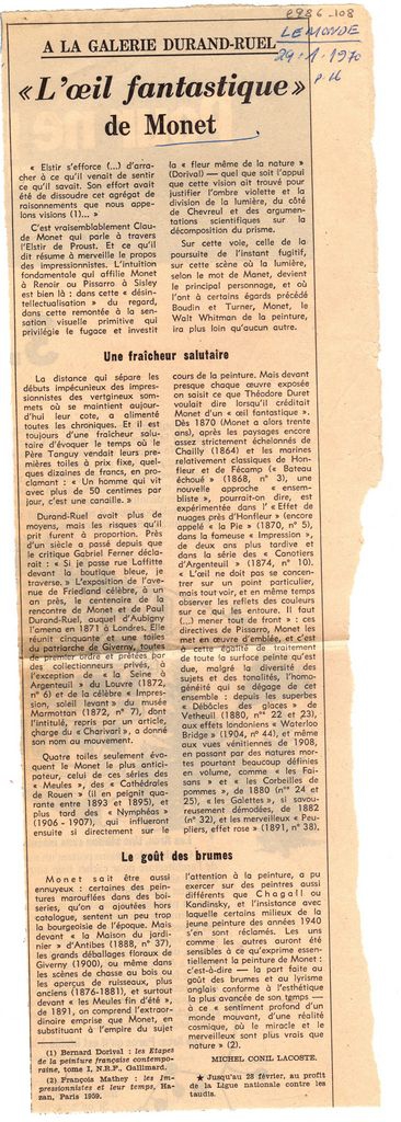 Απόκομμα, χαρτί, 35×11.5 εκ., στα γαλλικά, δημοσίευσης κριτικής αναδρομικής έκθεσης Claude Monet, η οποία διεξάγεται στην γκαλερί Durant Ruel στο Παρίσι. Σχολιάζεται η ζωγραφική του.