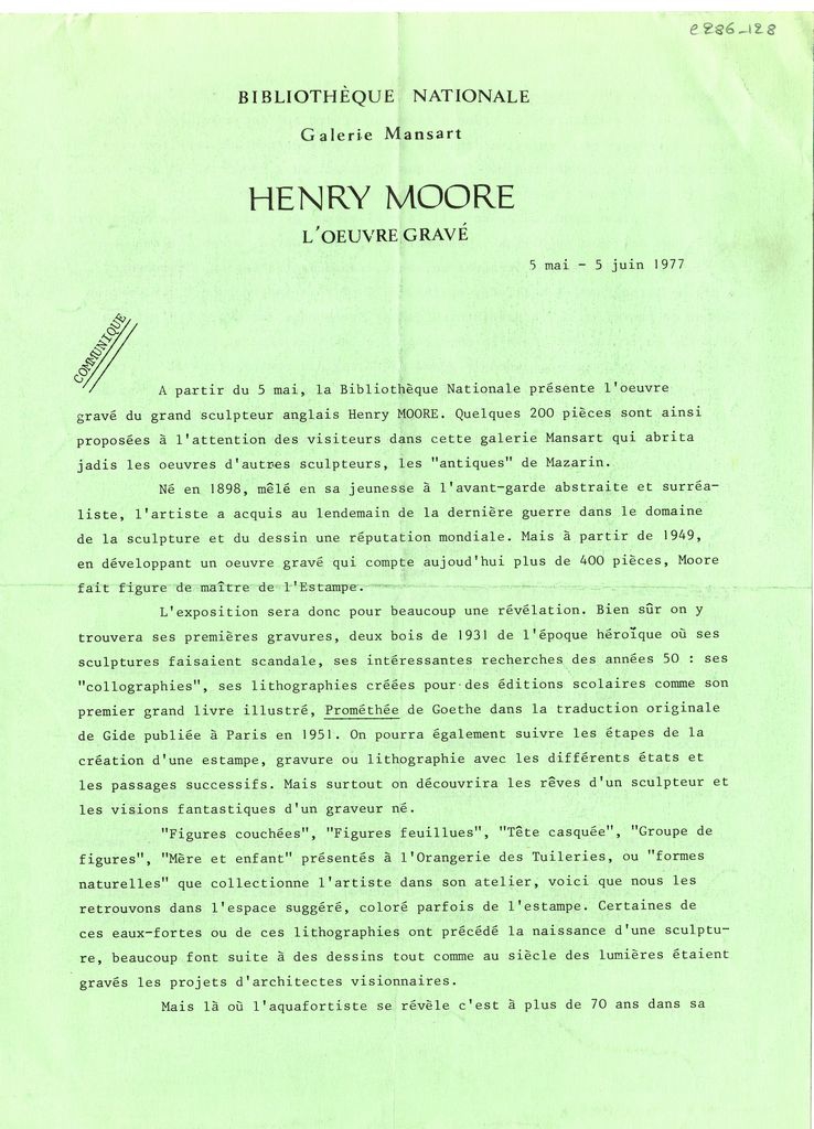 Δελτιο τύπου, χαρτί διπλής όψης, 30×21 εκ., στα γαλλικά, έκθεσης Henry Moore, η οποία διεξάγεται στην Εθνική Πινακοθήκη στο Παρίσι. Αναγράφονται λεπτομέρειες για τα έργα του καλλιτέχνη που παρουσιάζονται εκεί.