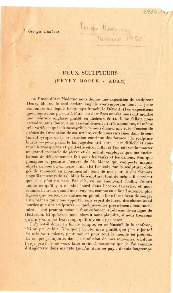 Απόκομμα, χαρτί, 4 φφ, 22×14 εκ., στα γαλλικά, δημοσίευσης κριτικής εκθέσεων των Henry Moore και Henri Georges Adam οι οποίες διεξάγονται στο Μουσείο Μοντέρνας Τέχνης και στην Galerie Maeght αντίστοιχα. Σχολιάζονται τα έργα που παρουσιάζονται σε αυτές.