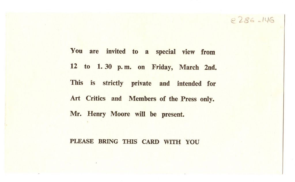 Πρόσκληση, χαρτόνι, 8×14 εκ., στα αγγλικά, εγκαινίων εκθεσης Henry Moore για τους εκπροσώπους του Τύπου, η οποία διεξάγεται στο Ζάππειο Μέγαρο στην Αθήνα.