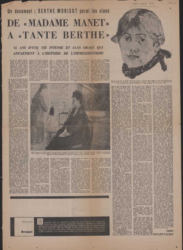 Απόκομμα, χαρτί, 60×42 εκ., στα γαλλικά, δημοσίευσης κειμένου της Agathe Rouart-Valéry, στο οποίο αναφέρεται στη ζωγραφική της Berthe Morisot, με αφορμή αναδρομική έκθεση η οποία διεξάγεται στο μουσείο Jacquemart André στο Παρίσι.