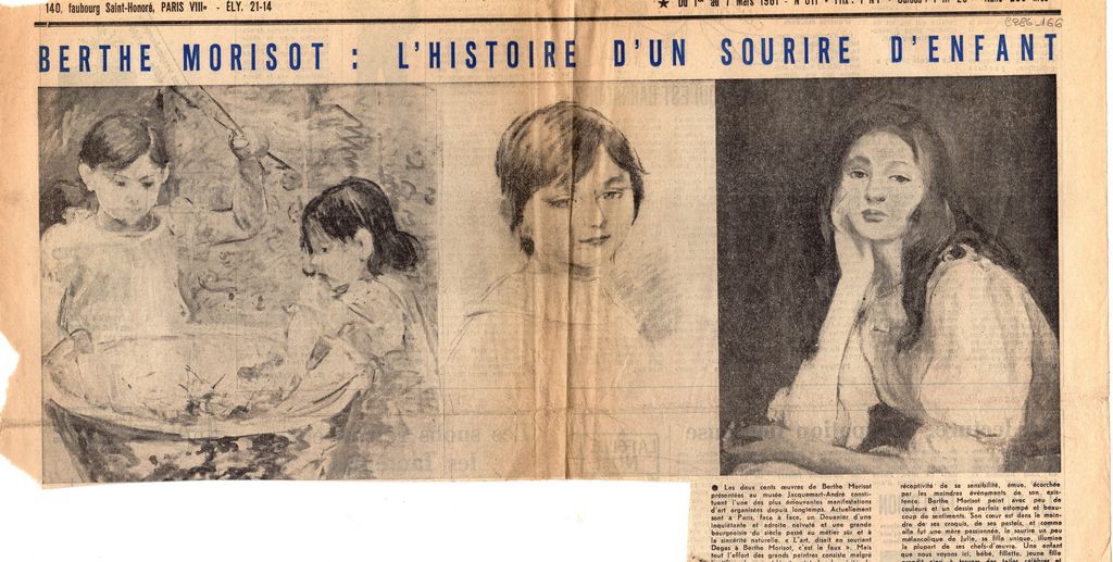 Απόκομμα, χαρτί ακανόνιστου μεγέθους, στα γαλλικά, δημοσίευσης αναπαραγωγών έργων της Berthe Morisot, τα οποία παρουσιάζονται σε αναδρομική έκθεση στο μουσείο Jacquemart André στο Παρίσι.