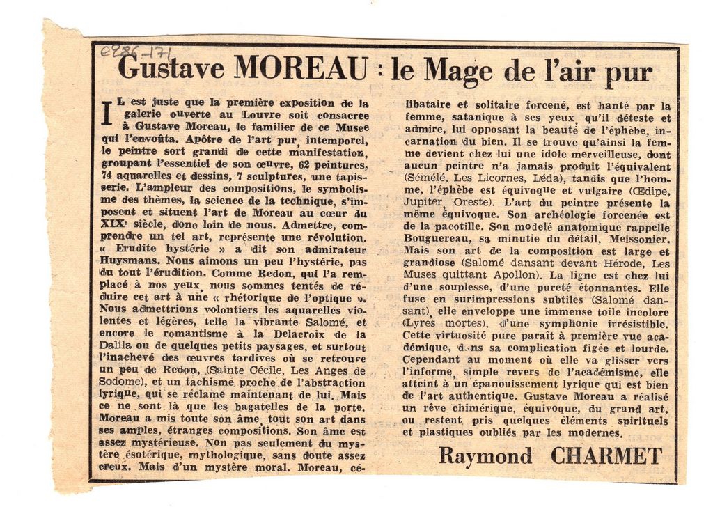 Απόκομμα, χαρτί, 11×16 εκ., στα γαλλικά, δημοσίευσης κριτικής έκθεσης Gustave Moreau, η οποία διεξάγεται στο Λούβρο στο Παρίσι.