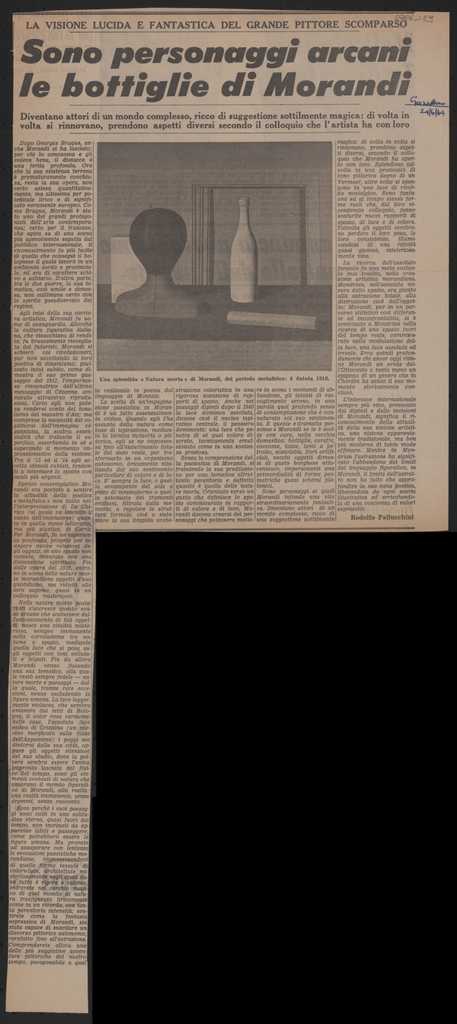 Απόκομμα, χαρτί ακανόνιστου μεγέθους, στα ιταλικά, δημοσίευσης άρθρου αναφερόμενου στο εικαστικό έργο του Giorgio Morandi.