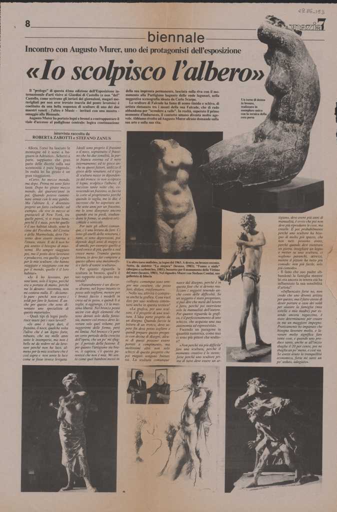 Απόκομμα, χαρτί, 48×32 εκ., στα ιταλικά, δημοσίευσης συνέντευξης του Augusto Murer, με αφορμή την συμμετοχή του στην 41η Μπιεννάλε Βενετίας.
