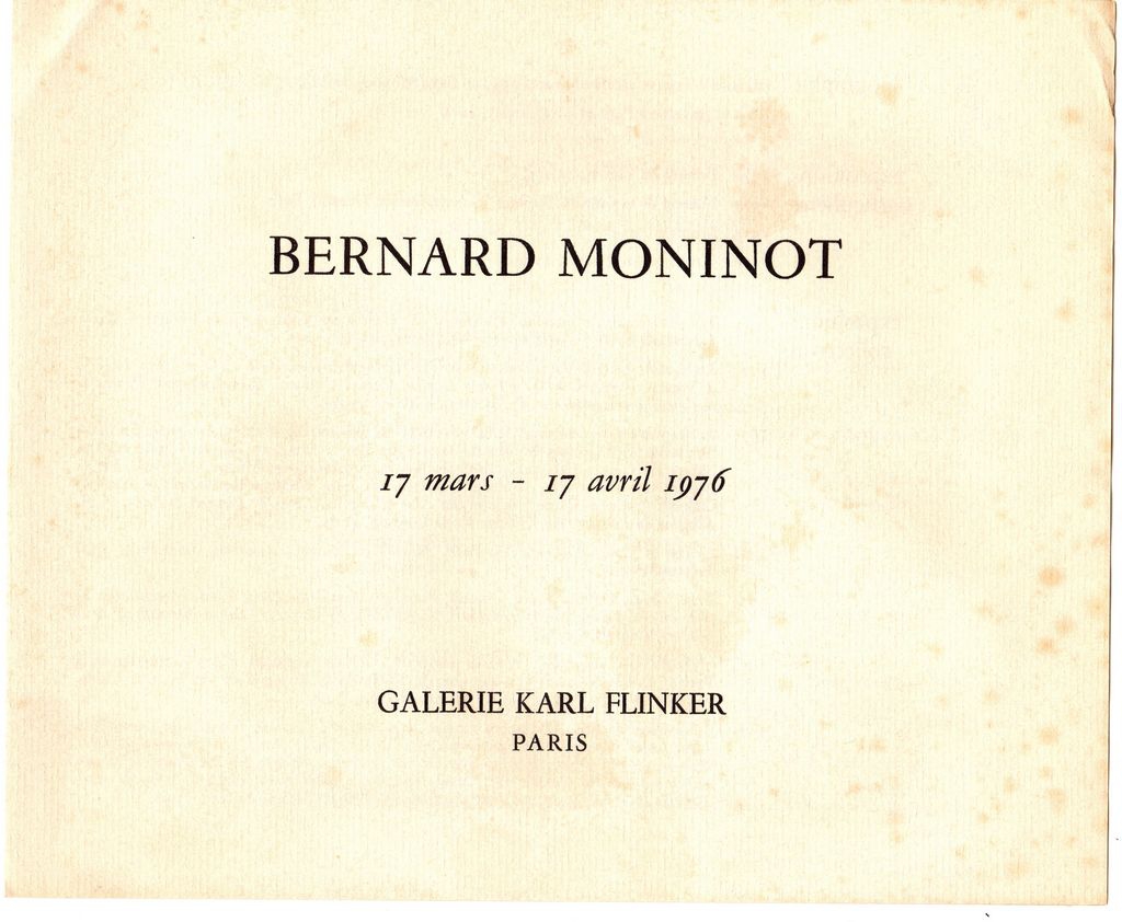 Έντυπο, χαρτί, 2 φφ, 19×23 εκ., στα γαλλικά, έκθεσης του Bernard Moninot, η οποία διεξάγεται στην γκαλερί Karl Flinker στο Παρίσι. Περιέχει βιογραφικό του καλλιτέχνη, βιβλιογραφία και κατάλογο των έργων του που παρουσιάζονται στην έκθεση.