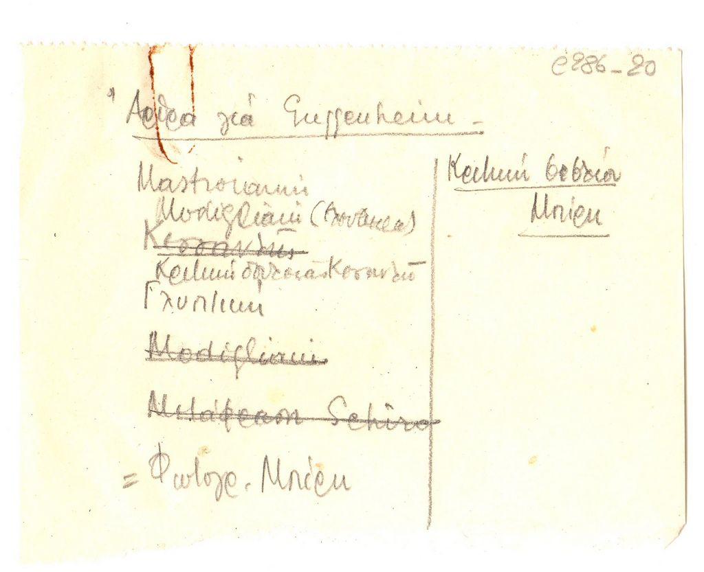 Απόκομμα χαρτιού, 4 φφ, με χειρόγραφες με μολύβι στα γαλλικά και ελληνικά σημειώσεις του Τώνη Σπητέρη για τον Amedeo Modigliani.