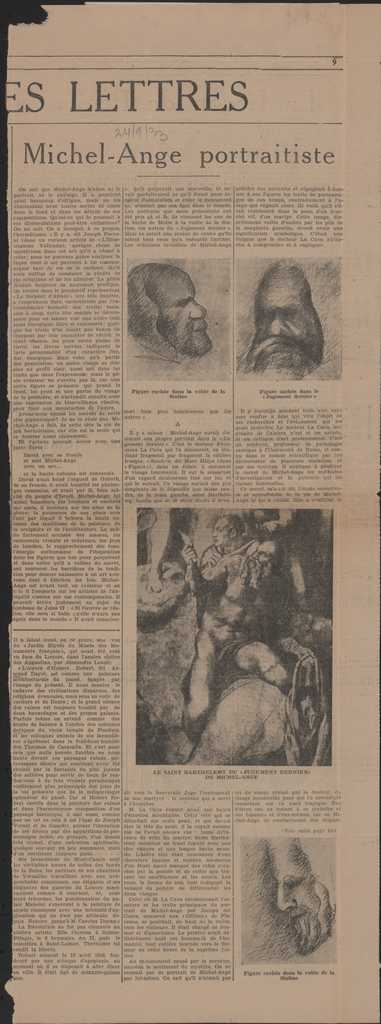 Απόκομμα, χαρτί, 54×20 εκ., στα γαλλικά, δημοσίευσης άρθρου το οποίο αναφέρεται στο εικαστικό έργο του Michelangelo Buonarroti. Σχολιάζονται πορτρέτα του καλλιτέχνη.