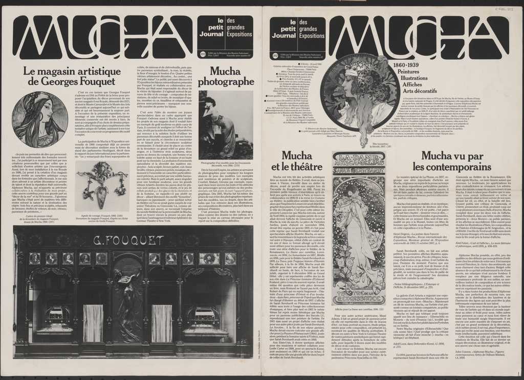 Έντυπο, χαρτί, 2 φφ, 46×33 εκ., στα γαλλικά, αφιερωμένο στην αναδρομική έκθεση Alphonso Mucha, η οποία διεξάγεται στο Grand Palais στο Παρίσι. Το έντυπο περιέχει κείμενα για τον καλλιτέχνη και το έργο του, βιογραφικό του σημείωμα και πληροφορίες για προηγούμενές του εκθέσεις.