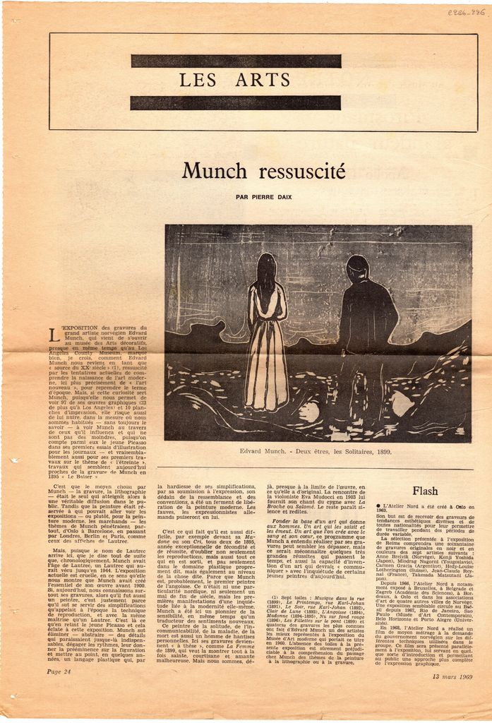 Απόκομμα, χαρτί, 42×30 εκ., στα γαλλικά, δημοσίευσης κριτικής αναδρομικής έκθεσης Edvard Munch, η οποία διεξάγεται στο Musée des Arts Décoratifs στο Παρίσι. Αναγράφονται λεπτομέρειες και σχόλια για τα έργα του καλλιτέχνη που παρουσιάζονται σε αυτή.