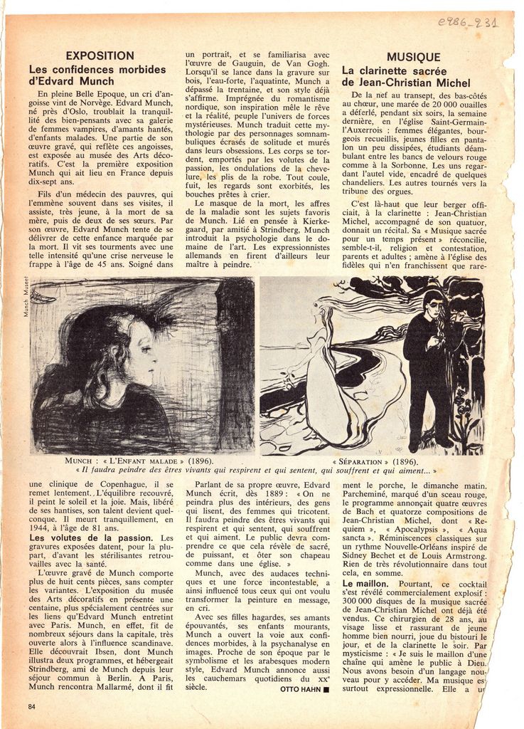 Απόκομμα, χαρτί, 28×20 εκ., στα γαλλικά, δημοσίευσης κριτικής αναδρομικής έκθεσης Edvard Munch, η οποία διεξάγεται στο Musée des Arts Décoratifs στο Παρίσι. Αναγράφονται λεπτομέρειες για τα έργα του καλλιτέχνη που παρουσιάζονται σε αυτή.