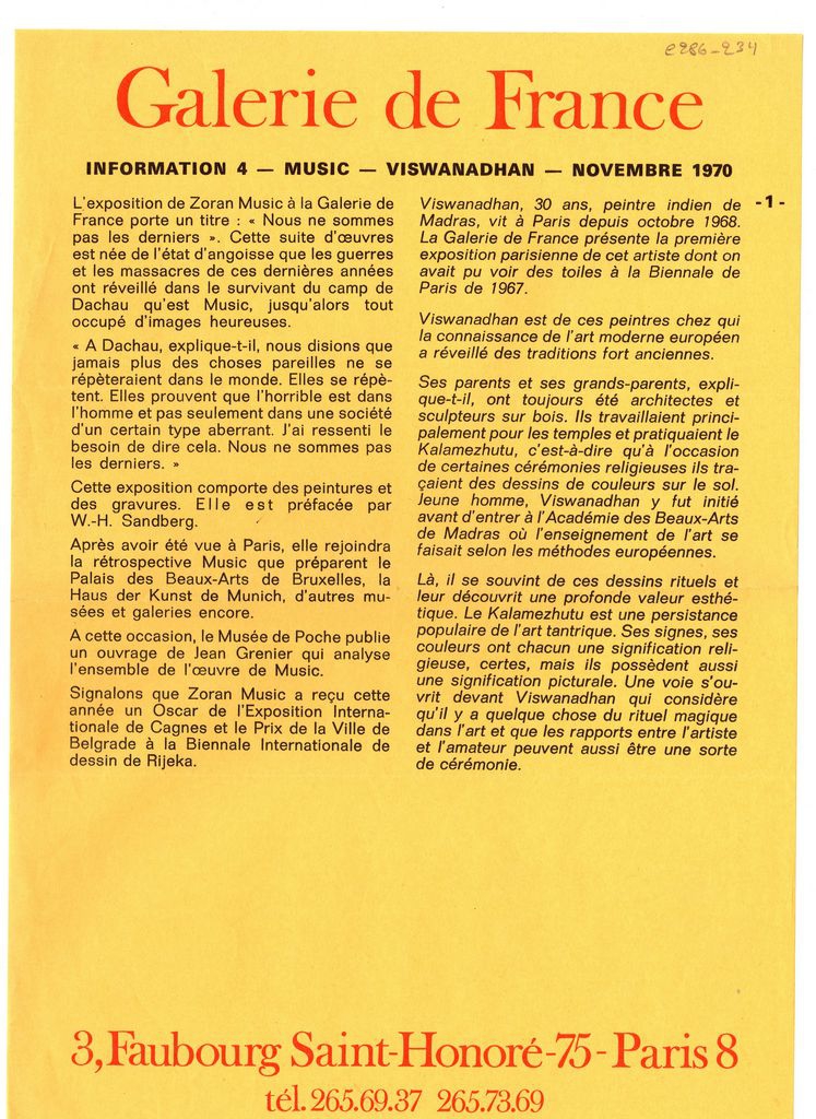 Έντυπο, χαρτί, 30×21 εκ., στα γαλλικά, έκθεσης Zoran Music, η οποία διεξάγεται στην Galerie de France στο Παρίσι. Αναγράφονται λεπτομέρειες για τα έργα του καλλιτέχνη που παρουσιάζονται σε αυτή.