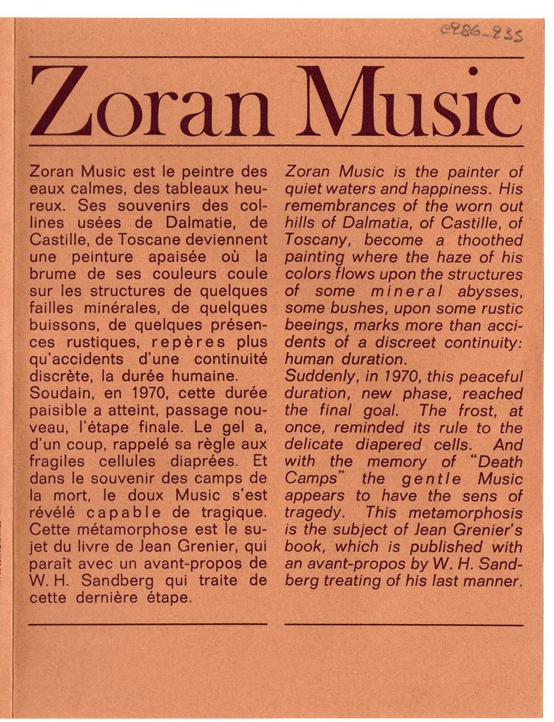 Ενημερωτικό έντυπο και δελτίο παραγγελίας, χαρτί αναδιπλωμένο, 18.5×14 εκ., στα γαλλικά και αγγλικά, βιβλίου αφιερωμένου στον Zoran Music, το οποίο κυκλοφορεί στο πλαίσιο έκθεσής του στην Galerie de France στο Παρίσι. Αναγράφονται λεπτομέρειες για την έκδοση.