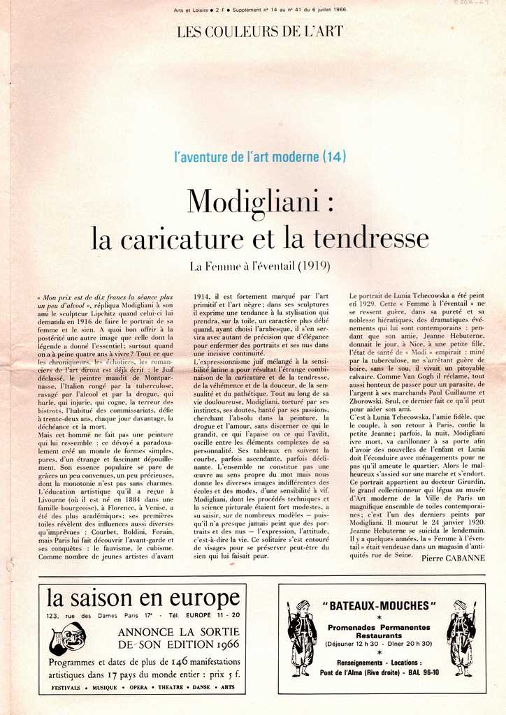Απόκομμα, χαρτί, 2 φφ, 40×28 εκ., στα γαλλικά, δημοσίευσης άρθρου αναφερόμενου στο εικαστικό έργο του Amedeo Modigliani. Σχολιάζεται το έργο του “La femme à l’ éventail”