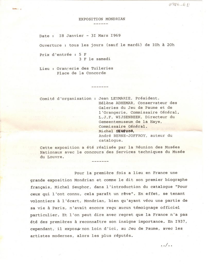 Δακτυλόγραφο δελτίο τύπου, χαρτί, 2 φφ, 27×21 εκ., στα γαλλικά, έκθεσης Piet Mondrian, η οποία διεξάγεται στην Orangerie στο Παρίσι. Αναγράφονται λεπτομέρειες για τη διοργάνωση και τα έργα του καλλιτέχνη που παρουσιάζονται σε αυτή.