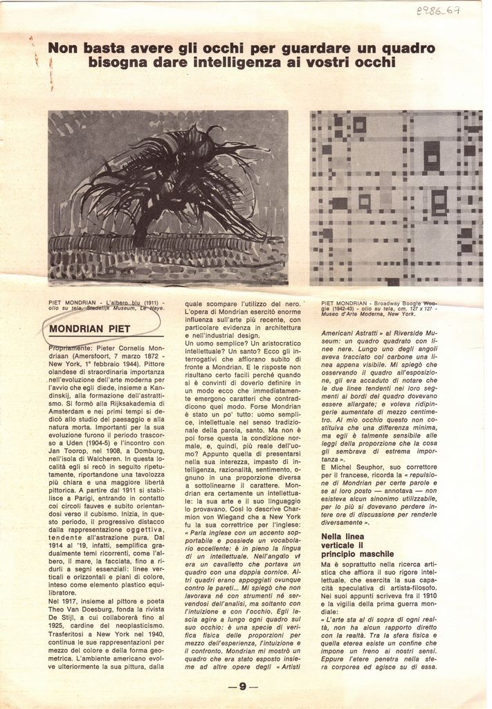 Απόκομμα, χαρτί διπλής όψης, 30×21 εκ., στα ιταλικά, δημοσίευσης κειμένου αφιερωμένου στη ζωή και στο εικαστικό έργο του Piet Mondrian. Στο ίδιο κείμενο για τον Pablo Picasso και το έργο του.