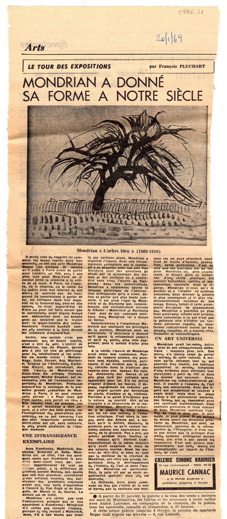 Απόκομμα, χαρτί, 43×17.5 εκ., στα γαλλικά, δημοσίευσης άρθρου αφιερωμένου στο εικαστικό έργο του Piet Mondrian, με αφορμή αναδρομική έκθεση η οποία διεξάγεται στην Orangerie στο Παρίσι.