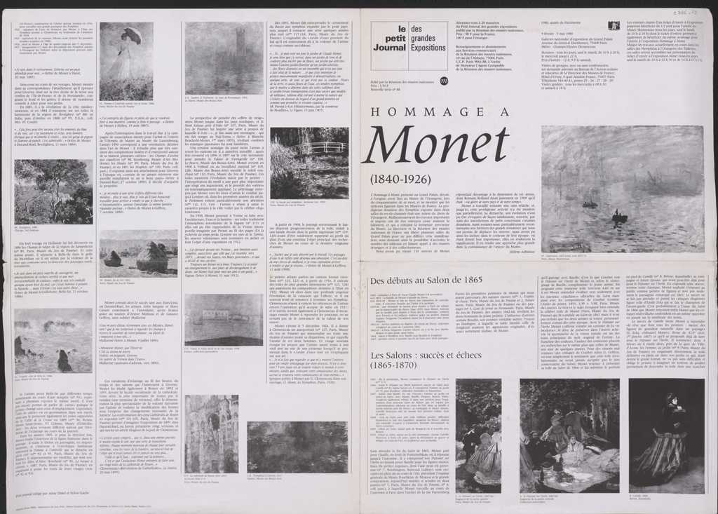 Έντυπο, χαρτί, 45×32 εκ., στα γαλλικά, αφιερωμένο στον Claude Monet, το οποίο κυκλοφορεί στο πλαίσιο αναδρομικής έκθεσης- αφιέρωμα στον καλλιτέχνη, η οποία διεξάγεται στο Grand Palais στο Παρίσι. Αναγράφονται λεπτομέρειες για τη ζωή και το έργο του, τις καλλιτεχνικές περιόδους και χαρακτηριστικά έργα που εντάσσονται σε αυτές.