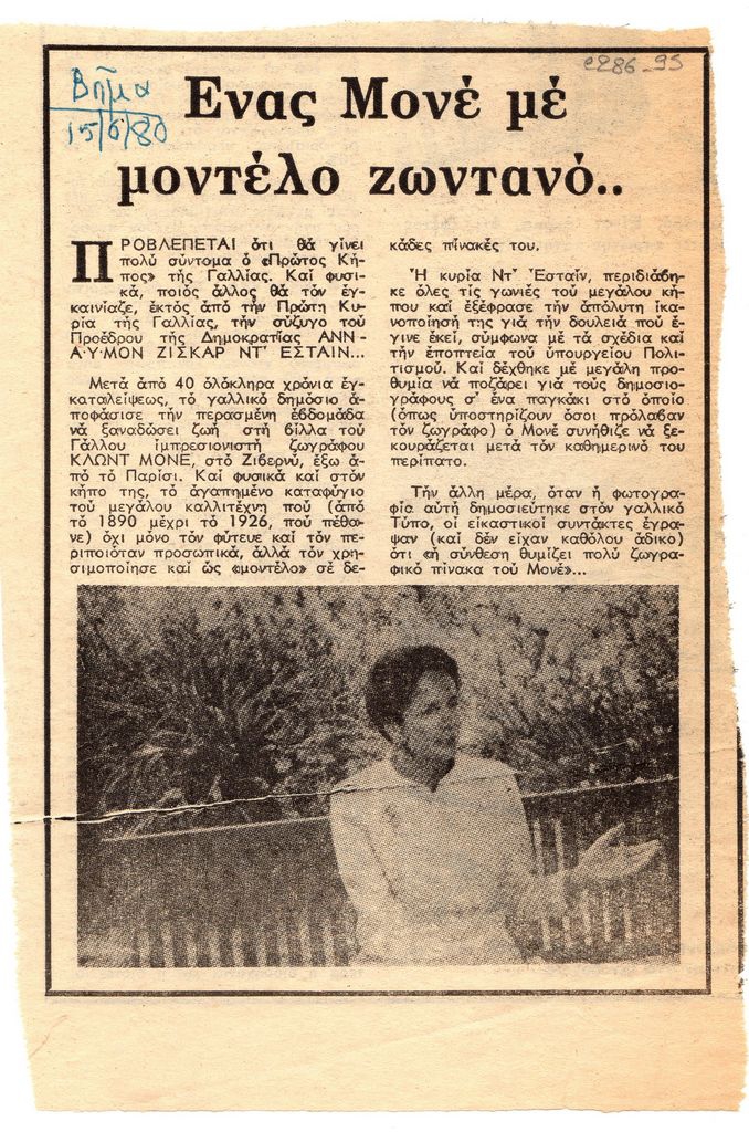 Απόκομμα, χαρτί, 19×13 εκ., στα ελληνικά, δημοσίευσης άρθρου το οποίο αναφέρεται στην πρωτοβουλία της πρώτης κυρίας της Γαλλίας, Anne-Aymone Giscard d’ Estaing, να μετατρέψει σε μουσείο-εκθεσιακό χώρο το σπίτι του Claude Monet στην Giverny. Αναγράφονται λεπτομέρειες.