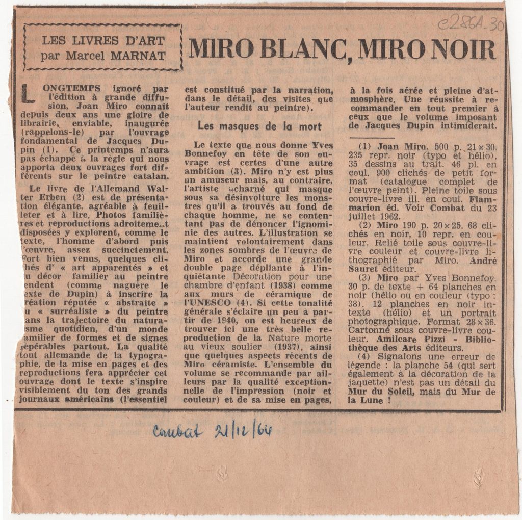 Απόκομμα, χαρτί, 15,5 x 14,5 εκ., στα γαλλικά, δημοσίευσης άρθρου αναφερόμενου σε κυκλοφορίες εκδόσεων για τον Juan Miró. Σχολιάζεται το εκδοτικό ενδιαφέρον για τον καλλιτέχνη. Το απόκομμα φέρει επιγραφές.