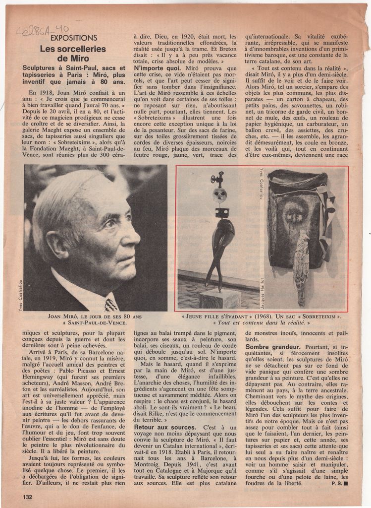 Απόκομμα, χαρτί, 28 x 20 εκ., στα γαλλικά, δημοσίευσης κειμένου αναφερόμενου στο εικαστικό έργο του Juan Miró, με αφορμή εκθέσεις του καλλιτέχνη, οι οποίες διεξάγονται στην Fondation Maeght στο Παρίσι και στο Φεστιβάλ που διοργανώνει η γκαλερί στο Saint-Paul de Vence. Το απόκομμα εικονογραφείται.
