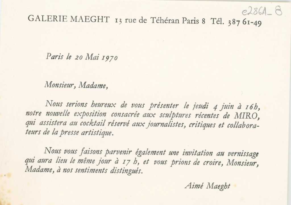 Πρόσκληση, χαρτόνι, 10 x 14 εκ., στα γαλλικά, απεσταλμένη από τον Aimé Maegth προς τον Τώνη Σπητέρη. Προσκαλούνται εκπρόσωποι του τύπου και κριτικοί της τέχνης στην έκθεση γλυπτικής του Juan Miró, που διεξάγεται στην Galerie Maegth στο Παρίσι. Σημειώνεται δεξίωση στο πλαίσιο του καλέσματος.