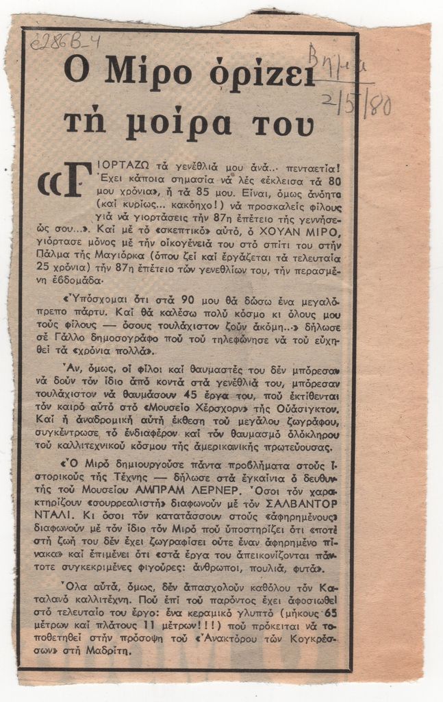 Απόκομμα, χαρτί, 18 x 11 εκ., στα ελληνικά, δημοσίευσης άρθρου το οποίο αναφέρεται στον εορτασμό των 85 χρόνων από τη γέννηση του Juan Miró.