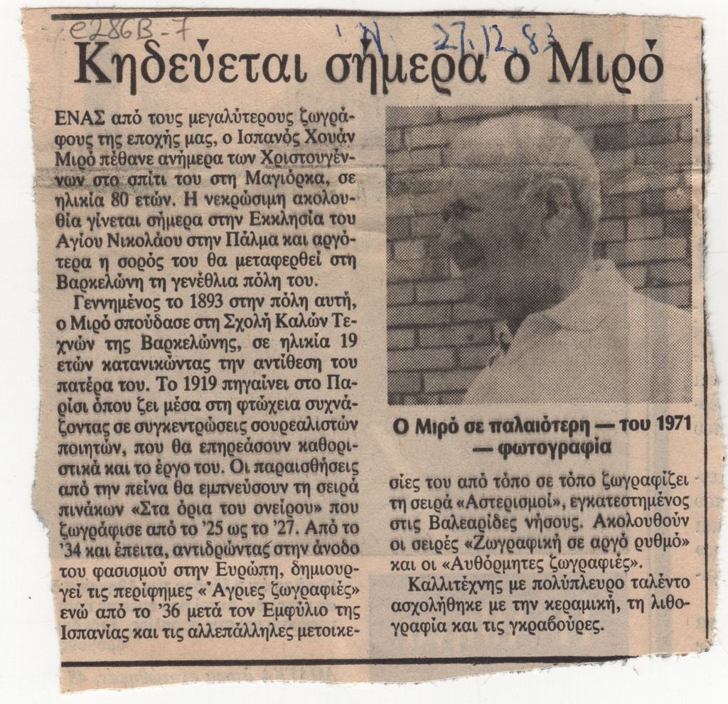 Απόκομμα, χαρτί, 10 x 10 εκ., στα ελληνικά, δημοσίευσης άρθρου το οποίο αναφέρεται στο θάνατο του Juan Miró. Εικονογραφείται και φέρει επιγραφή.