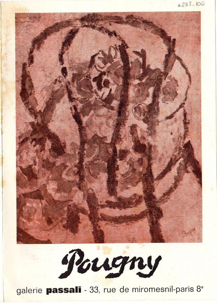 Έντυπο, στα γαλλικά, δίπτυχο, χαρτόνι, 21,0×15,0 εκ. Πρόσκληση των εγκαινίων της ατομικής έκθεσης έργων του Ρώσου ζωγράφου έκθεσης Jean Pougny που πραγματοποιήθηκε στο Παρίσι το 1974. Περιέχει κείμενο για τον καλλιτέχνη του René Barotte και βιογραφικό καλλιτέχνη.