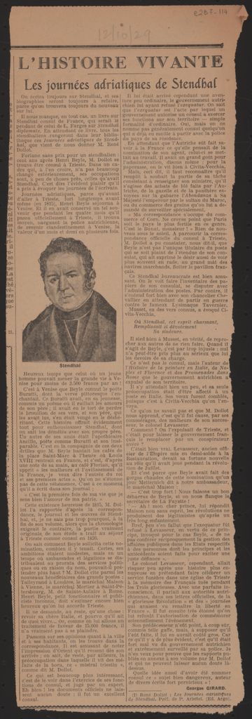 Απόκομμα, έντυπο, χαρτί, 44,5×14,2 εκ., όπου δημοσιεύεται, στα γαλλικά, άρθρο για τις επιστολές του Γάλλου ζωγράφου Nicolas Poussin. Επάνω, επιγραφή. Στο ίδιο απόκομμα: Georges Girard, L’Histoire vivant. Les journées adriatiques de Stendhal.