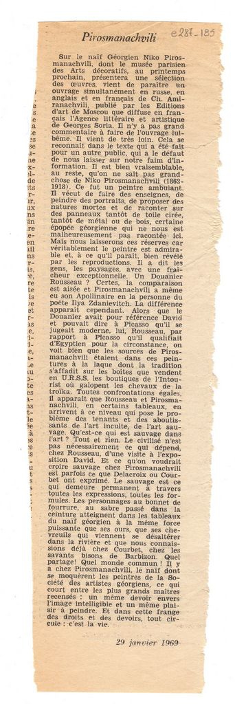 Απόκομμα, έντυπο, χαρτί, 29,0×80,0 εκ., όπου δημοσιεύεται, στα γαλλικά, άρθρο για τον Γεωργιανό αυτοδίδακτο ζωγράφου Niko Pirosmanashvili με αφορμή την πραγματοποίηση έκθεσης έργων του στο Παρίσι το 1969.