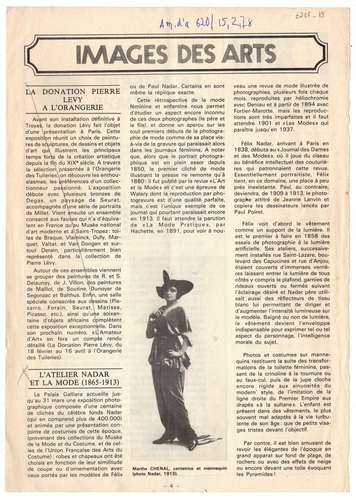 Απόκομμα, έντυπο, χαρτί, 29,8×21,0 εκ., όπου δημοσιεύεται, στα γαλλικά, άρθρο για την έκθεση φωτογραφιών του Γάλλου φωτογράφου Nadar που πραγματοποιήθηκε στο Παρίσι το 1978. Στο ίδιο απόκομμα: “La donation Pierre Levy à l’Orangerie”. Επάνω, επιγραφή με τα στοιχεία της δημοσίευσης.