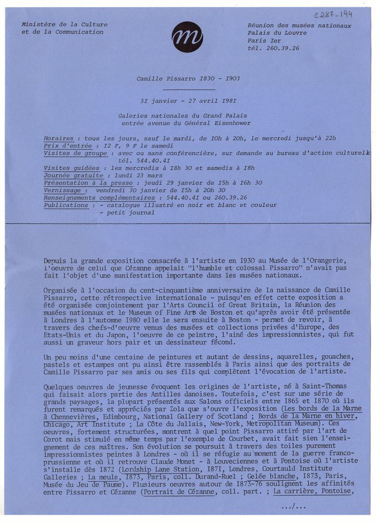 Κείμενο, στα γαλλικά, δακτυλόγραφο, χαρτί, δύο όψεις, 29,7×21,0 εκ. Δελτίο τύπου της αναδρομικής έκθεσης έργων του Γάλλου ζωγράφου Camille Pissarro που πραγματοποιήθηκε στο Παρίσι το 1981.