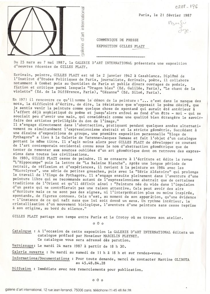Κείμενο, στα γαλλικά, δακτυλόγραφο, χαρτί, 29,7×21,0 εκ. Δελτίο τύπου της ατομικής έκθεσης έργων του εικαστικού καλλιτέχνη Gilles Plazy που πραγματοποιήθηκε στο Παρίσι το 1987. Επάνω, επιγραφή.