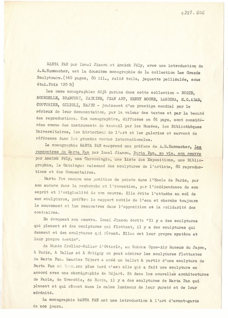 Κείμενο, στα γαλλικά, δακτυλόγραφο, χαρτί, 29,7×21,0 εκ. Ενημερωτικό φυλλάδιο για την έκδοση των Ionel Jianou και Annick Pély με θέμα τη γλύπτρια Marta Pan που κυκλοφόρησε από τη σειρά “Les Grands Sculpteurs” [το 1974].