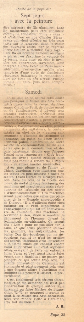 Απόκομμα, έντυπο, χαρτί, 43,0×30,0 εκ., όπου δημοσιεύεται, στα γαλλικά, απόσπασμα της εβδομαδιαίας στήλης κριτική του Georges Boudaille. Στo ίδιο απόκομμα: Pancino “L’attitude piégée de Julio Le Parc”, “Dans les galeries avec Claude Bouyeure, Marie-Claude Volfin, Bruno Marcenac et Henri Adam” και αναγγελίες εκθέσεων της περιόδου.