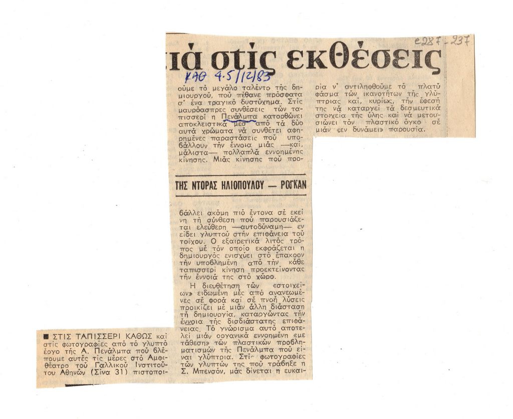 Απόκομμα, έντυπο, χαρτί, 13,0×15,5 εκ., όπου δημοσιεύεται, στα ελληνικά, κριτική της Ντόρας Ηλιοπούλου-Ρογκάν για την ατομική έκθεση έργων της Alicia Penalba που πραγματοποιήθηκε στην Αθήνα το 1983. Επάνω, επιγραφή με τα στοιχεία της δημοσίευσης.