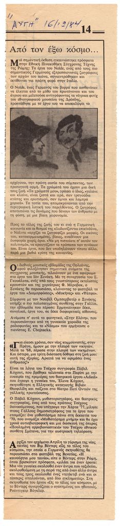 Απόκομμα, έντυπο, χαρτί, 43,0×9,2 εκ, όπου δημοσιεύεται, στα ελληνικά, διεθνές πολιτιστικό ρεπορτάζ από τον Δεκέμβριο του 1984. Αναφέρονται: η αναδρομική έκθεση έργων του Emil Nolde στη Ρώμη, το αφιέρωμα στον Ιάνη Ξενάκη στο πλαίσιο των διεθνών μουσικών εβδομάδων της Ορλεάνης, η παραγωγή του έργου της Elena Kohout “Adiedi” από το Théâtre de Petit Odéon του Παρισιού καθώς και την έναρξη των γυρισμάτων της νέας ταινίας του Wim Wenders με τον τίτλο “Ως το τέλος του κόσμου”. Επάνω, επιγραφή με τα στοιχεία της δημοσίευσης.