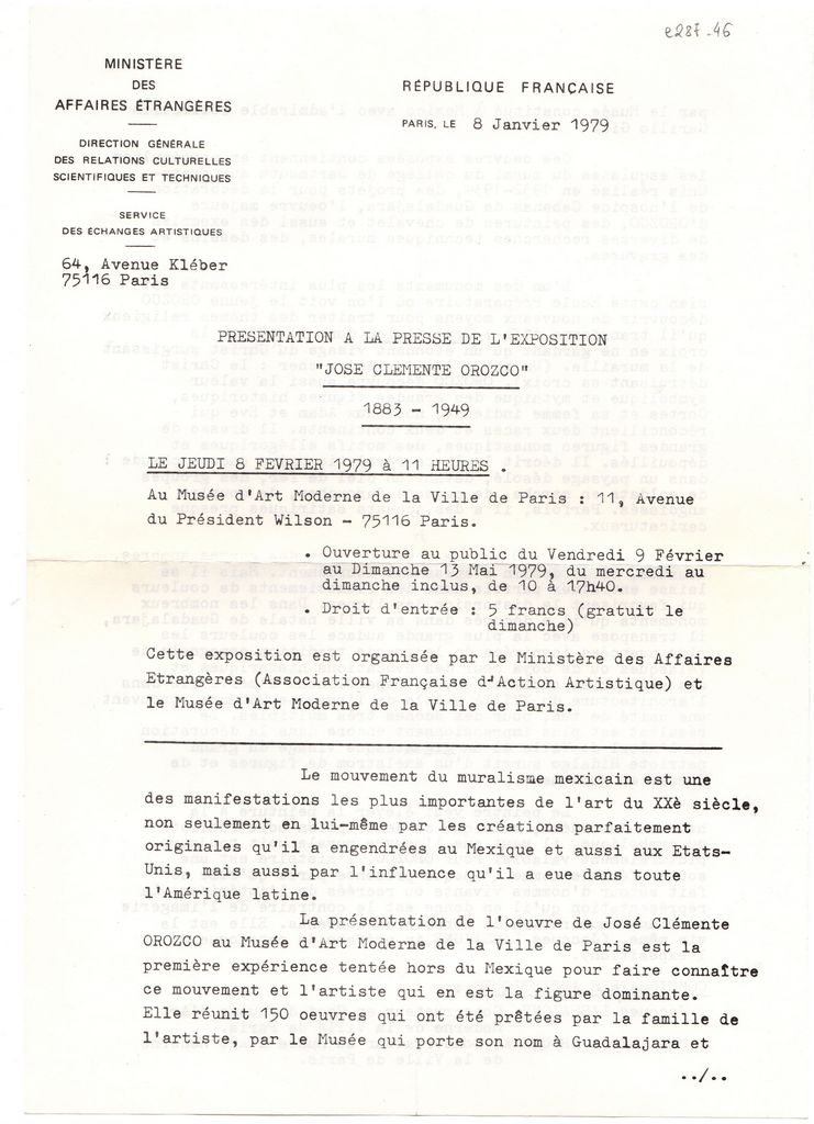Κείμενο, στα γαλλικά, δακτυλόγραφο, χαρτί, δύο όψεις, 29,7×21,0 εκ. Δελτίο τύπου της έκθεσης έργων του Μεξικανού καλλιτέχνη Jose Clemente Orozco που πραγματοποιήθηκε στο Παρίσι το 1979.