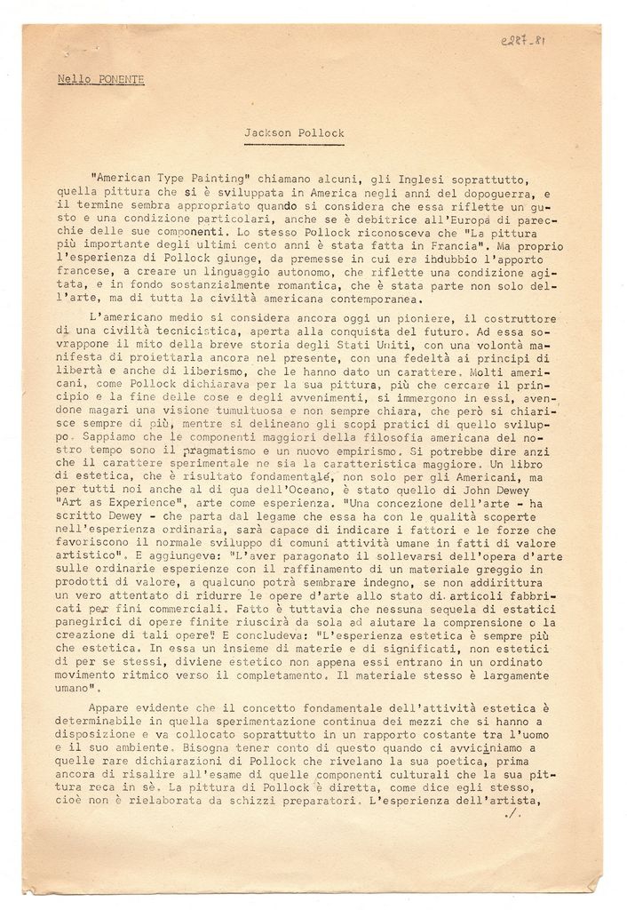 Κείμενο, στα ιταλικά, δακτυλόγραφο, χαρτί, 5 φφ., 33,0×22,0 εκ. Κείμενό ομιλίας (;) του ιστορικού τέχνης Nello Ponente για το έργο του Αμερικανού ζωγράφου Jackson Pollock. Συνδέεται με την πρώτη έκθεση έργων του καλλιτέχνη στη Ρώμη το 1958.