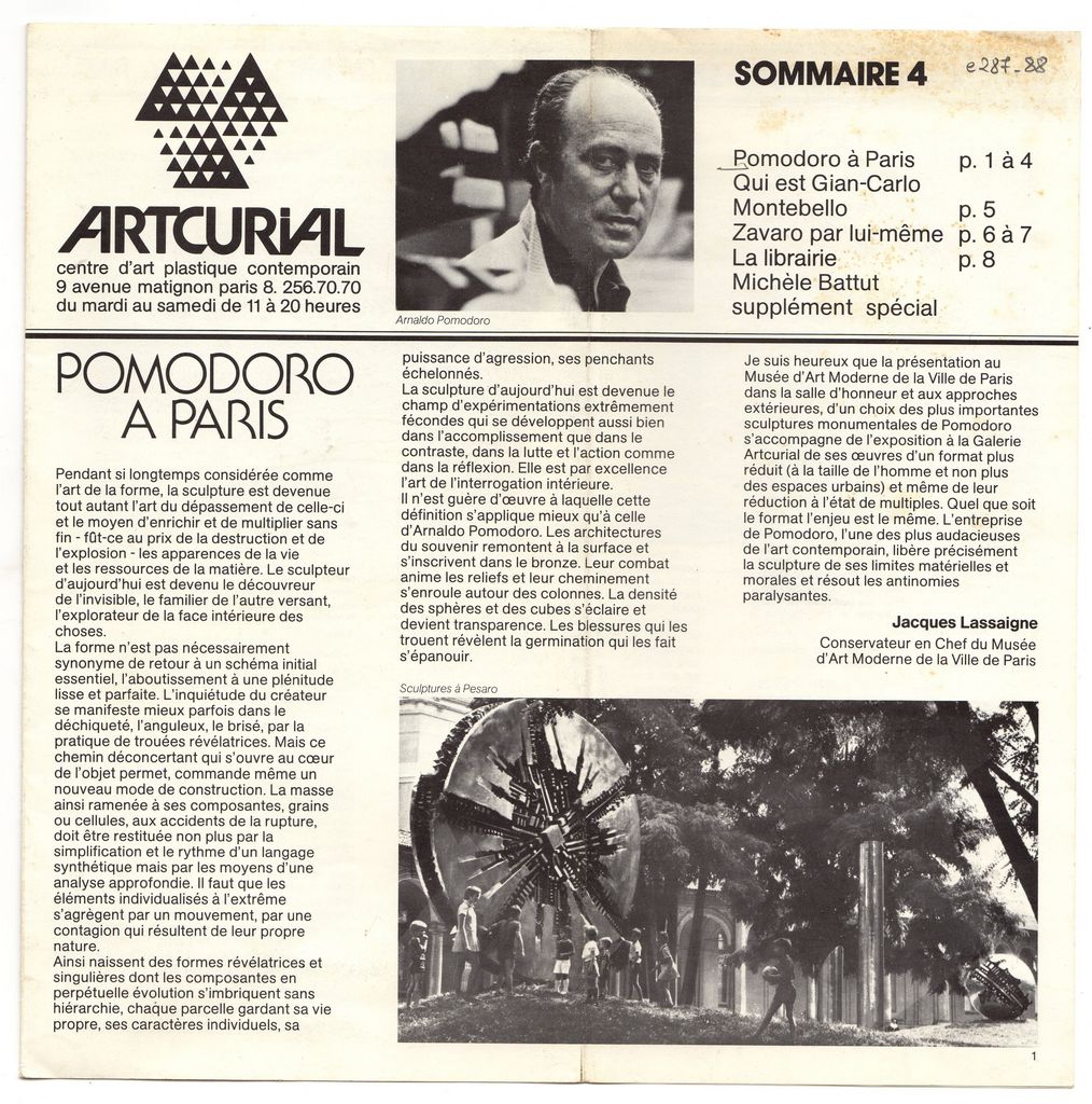 Έντυπο, 3 φφ (10 σσ.), χαρτί, 23,5×23,5 εκ., όπου δημοσιεύεται, στα γαλλικά, άρθρο του Jacques Lassaigne για τον Ιταλό καλλιτέχνη Arnoldo Pomodoro με αφορμή έκθεση έργων του που πραγματοποιήθηκε στο Παρίσι [το 1976]. Περιλαμβάνεται συνέντευξη με τον καλλιτέχνη. Στο ίδιο τεκμήριο: “Qui est Gian-Carlo Montebello?”, “Zavaro par lui-meme.”, “Entretien avec Michele Battut”.