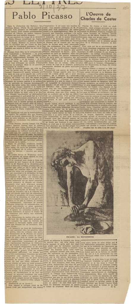 Απόκομμα, χαρτί, 48,5×20 εκ., στα γαλλικά, δημοσίευσης άρθρου αναφερόμενου στο εικαστικό έργο του Pablo Picasso, με αφορμή κυκλοφορία τόμου αφιερωμένου στον καλλιτέχνη.