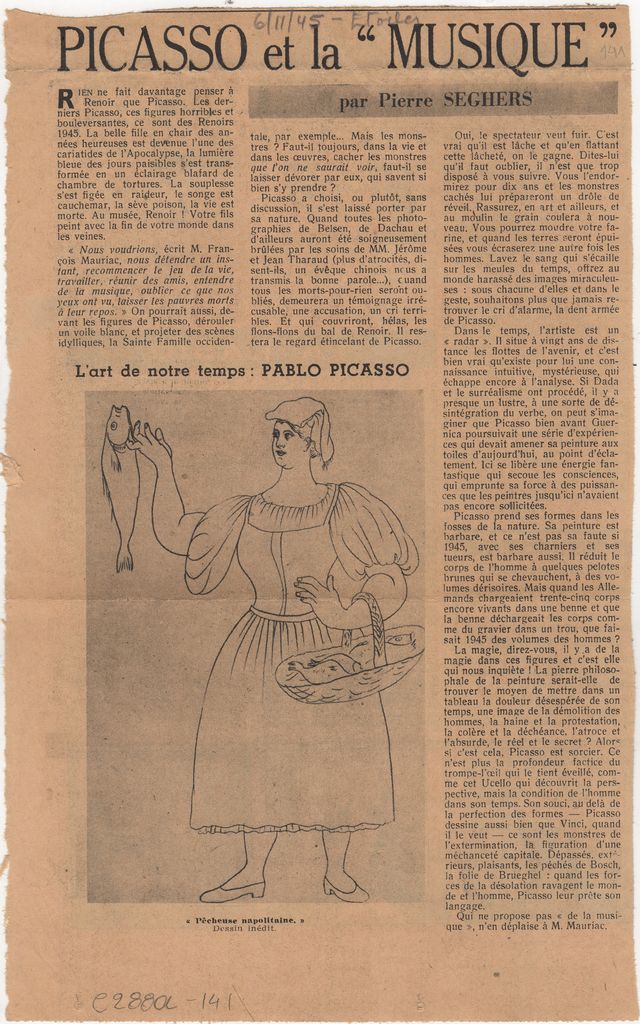 Απόκομμα, χαρτί, 30×18.5 εκ., στα γαλλικά, δημοσίευσης άρθρου αναφερόμενου στη ζωγραφική του Pablo Picasso. Παραλληλίζεται η ζωγραφική του με τη ζωγραφική του Renoir.