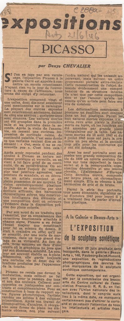 Απόκομμα, χαρτί, 26×10 εκ., στα γαλλικά, δημοσίευσης κριτικής έκθεσης του Pablo Picasso η οποία διεξάγεται στο Παρίσι.