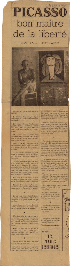 Απόκομμα, χαρτί, 49,5×13 εκ., 2 φφ, στα γαλλικά, δημοσίευσης ποιήματος του Paul Eluard για τον Pablo Picasso. Tο απόκομμα εικονογραφείται και φέρει επιγραφή.
