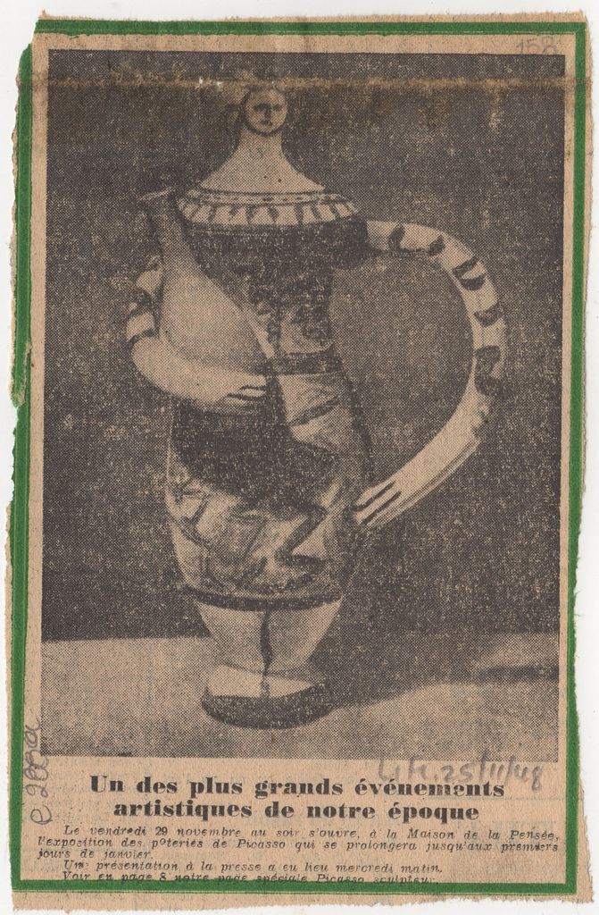 Απόκομμα, χαρτί, 17,5×11 εκ., στα γαλλικά, δημοσίευσης αναφερόμενης σε έκθεση κεραμικών του Pablo Picasso, η οποία διεξάγεται στο Παρίσι. Δίνονται πληροφορίες για τη διάρκεια της έκθεσης.