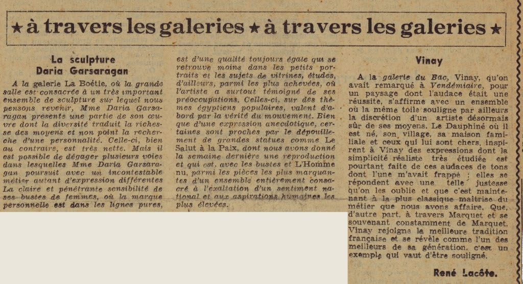 Απόκομμα, χαρτί, 42×30 εκ., στα γαλλικά, δημοσίευσης κριτικών εκθέσεων της περιόδου 1949, οι οποίες διεξάγονται στο Παρίσι.