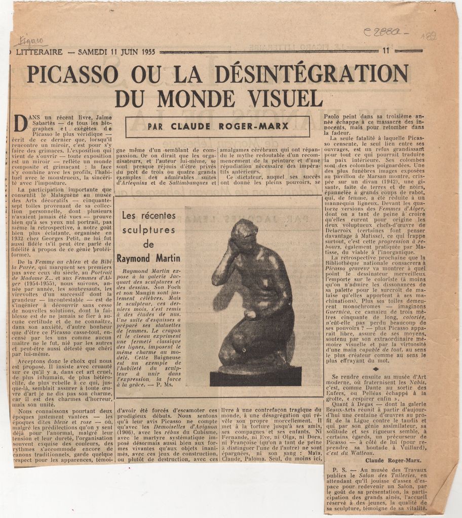 Απόκομμα, χαρτί ακανόνιστου μεγέθους, στα γαλλικά, δημοσίευσης άρθρου για τη ζωγραφική του Pablo Picasso, με αφορμή έκθεση του καλλιτέχνη στο Παρίσι.