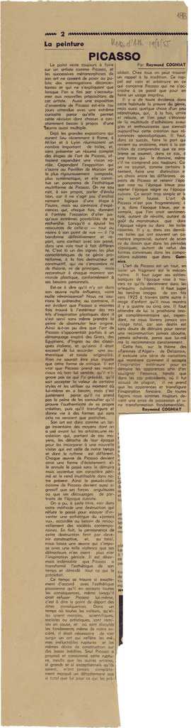 Απόκομμα, χαρτί ακανόνιστου μεγέθους, στα γαλλικά, δημοσίευσης κριτικής έκθεσης του Pablo Picasso στο Παρίσι. Σχολιάζεται πως τα έργα που παρουσιάζονται προέρχονται από όλες τις περιόδους εικαστικής του δημιουργίας.